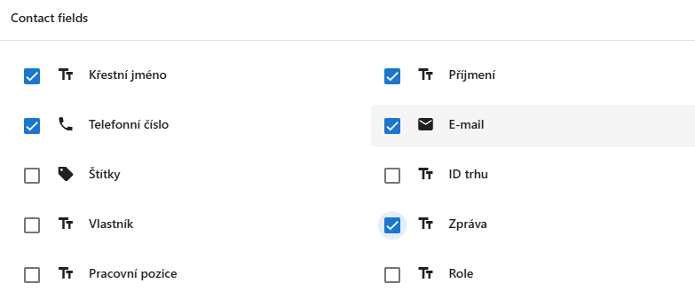 Klikněte na tlačítko "+ Přidat pole", rozbalí se nabídka mnoha polí, které lze do formuláře umístit. Rozděleny jsou do 4 sekcí. Zaklikněte políčka, která si přejete vložit do formuláře, potvrďte volbou "Přidat vybraná pole".