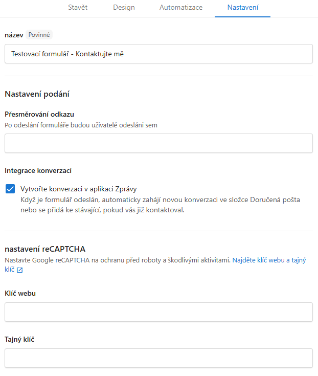Integrace konverzací - zde nastavujete, zda se odesláním formuláře má zahájit konverzace v aplikaci Zprávy nebo ne