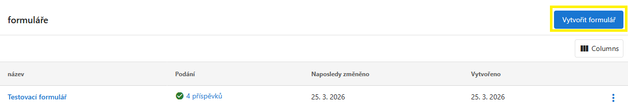 V části Formuláře klikněte na tlačítko "Vytvořit formulář" v pravém horním rohu (zvýrazněno žlutě):