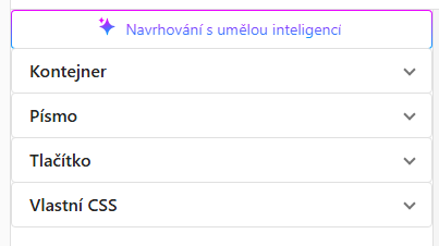 V této části lze nastavit, jak formulář bude vypadat: lze zvolit šířku, barvy, vzhled tlačítka apod. Úpravy jsou rozděleny do 4 částí. Lze také využít "Navrhování s umělou inteligencí".