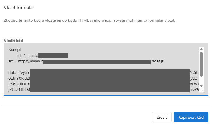 Pokud je formulář připraven, je potřeba ho umístit na vaše webové stránky. Klikněte na tlačítko "Vložit". Zobrazí se kód, který předáte svému správci webových stránek. Pomocí tohoto kódu poté formulář vloží na vaše webové stránky. Jakmile je formulář umístěn na webové stránky, jsou do něho automaticky propisovány změny, které provedete ve formuláři v Online Star.
