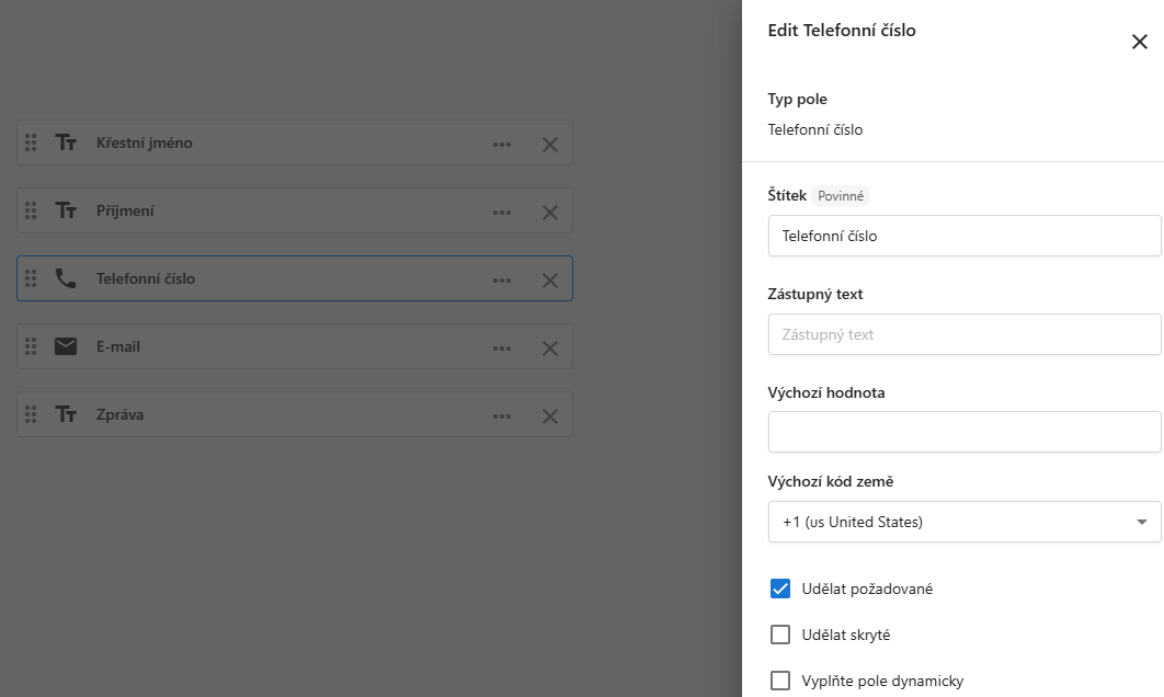 Dále můžete pole upravovat a nastavovat. Myší můžete měnit pořadí polí mezi sebou, stačí pole uchopit myší a přesunout. Křížkem lze pole odebrat, pokud kliknete u pole na ikonu "tři tečky", zobrazí se další nastavení daného pole. V obrázku níže je zvoleno nastavení pole "Telefonní číslo".