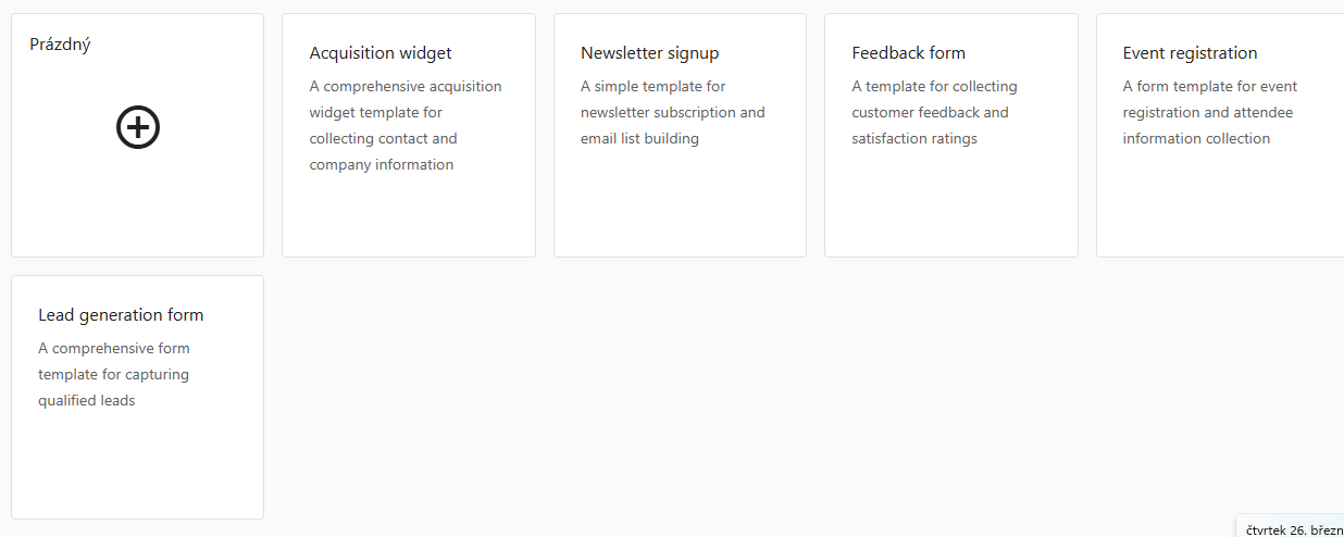 V následujícím kroku zvolte, zda si přejete vytvořit prázdný formulář nebo zda použijete přednastavenou šablonu. V šablonách jsou přednastavená pole formuláře. Další návod vás provede nastavením prázdného formuláře, klikněte tedy na "Prázdný" a zvolte název pro formulář.