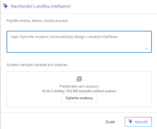 e) Navrhování s umělou inteligencí - velmi jednoduše lze požádavat AI, aby formulář upravila. Je nutné jí popsat, jakou změnu si ve formuláři přejete, případně jí můžete nahrát obrázek pro inspiraci. AI design formuláře upraví dle vašich pokynů. Pozor, je potřeba přesně popsat, jaké změny si přejete.