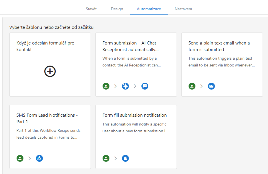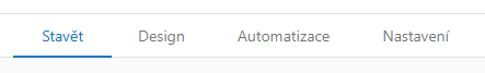 Ve formuláři je následně možné nastavovat ve 4 sekcích: Stavět, Design, Automatizace, Nastavení.