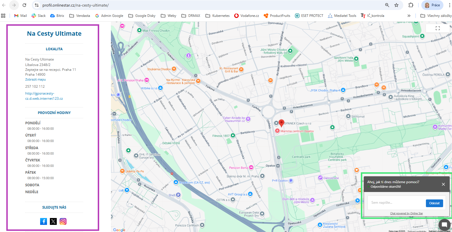 Vizitku zobrazíte kliknutím na "Zobrazit firemní vizitku" (zvýrazněno zeleně v obrázku výše). V levé části jsou uvedeny základní kontaktní údaje o vaší společnosti (zvýrazněno na obrázku níže fialově), v pravém dolním rohu je zeleně zvýrazněno chatovací okno, ve kterém můžete trénovat a zkoušet svého AI chat asistenta. Stačí mu pokládat otázky, bude odpovídat.