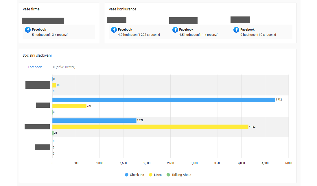 V části konkurence lze analyzovat rozdíly v metrikách facebookového účtu vaší společnosti a konkurentů, které jste si zvolili. V horní části vidíte, jakého hodnocení jste vy a konkurenti dosáhli a kolik recenzí jste obdrželi.