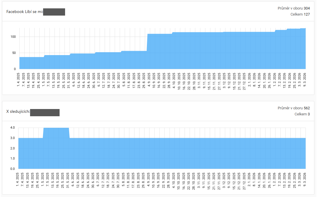 Zde jdou zobrazeny statistiky na sociální sítích. U Facebooku vývoj počtu "Líbí se mi", u sítě X vývoj počtu sledujících.