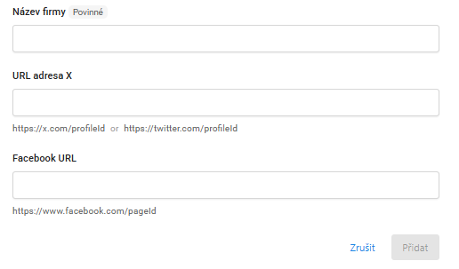 Klikněte na "+ Přidat konkurenta" a vyplňte odkazy na jejich firemní Facebook a případně i účet na síti X. Potvrďte tlačítkem "Přidat". Takto můžete přidat až 3 konkurenty.