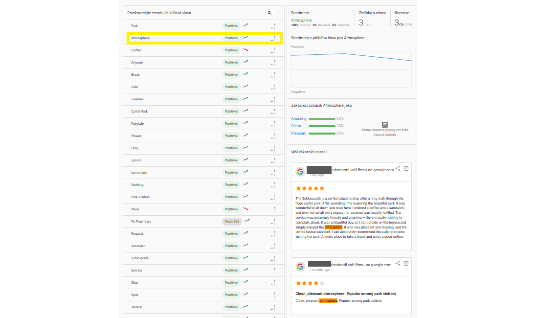 V levé části je přehled klíčových slov, která se vyskytují v recenzích, citacích, zmínkách. Kliknutím na slovo se v pravé části zobrazí statistiky k danému klíčovému slovu (sentiment, počty, vývoj sentimentu) a také ve spodní části konkrétní recenze, kde se to slovo vyskytovalo.