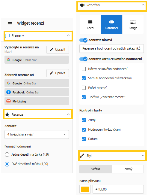 V levém menu Widget recenzí nastavíte, konkrétně 4 oblasti: