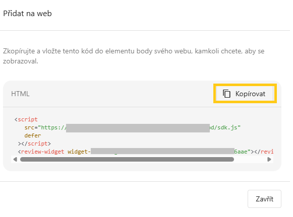 Nyní je potřeba widget umístit na vaše webové stránky. Klikněte na tlačítko "<> Přidat na web" (na obrázku výše v pravém horním rohu zvýrazněno žlutou barvou), objeví se okno s kódem. Pomocí tlačítka "Kopírovat" stačí vzít kód do paměti a umístit na vaše webové stránky nebo předat osobě, která vaše webové stránky spravuje.