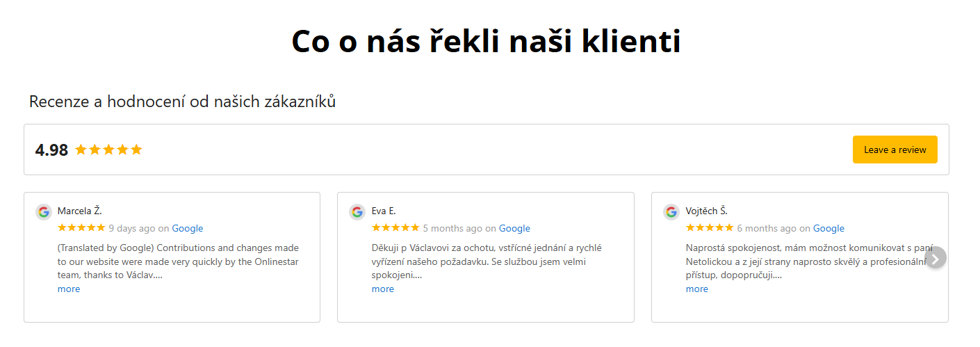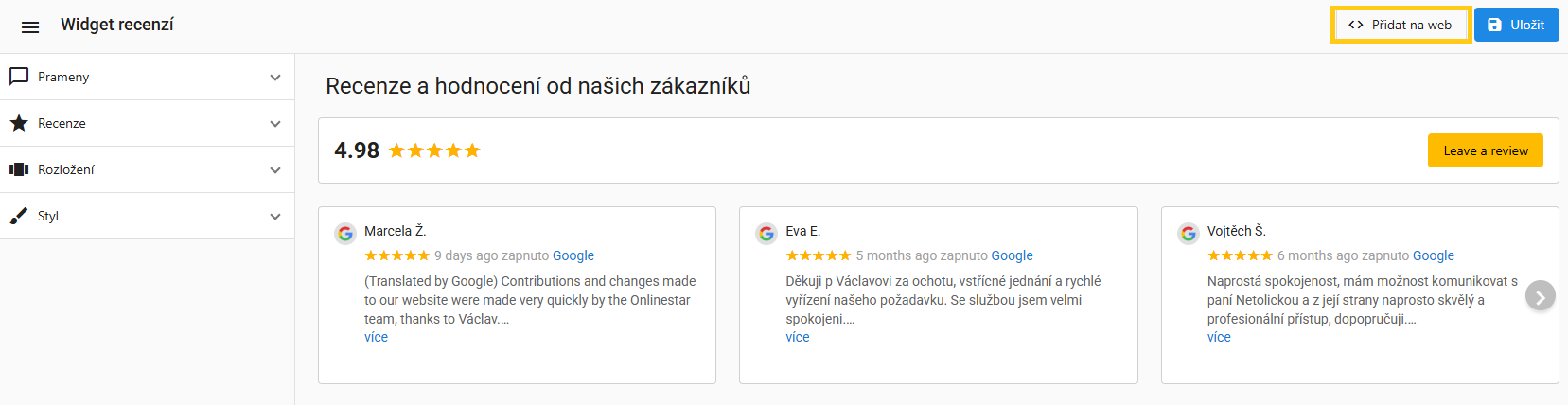 Pomocí této funkcionality si můžete dle určitých kritérií zvolit recenze, upravit zobrazení a pomocí tzv. widgetu tuto část s recenzemi umístit na vaše webové stránky.