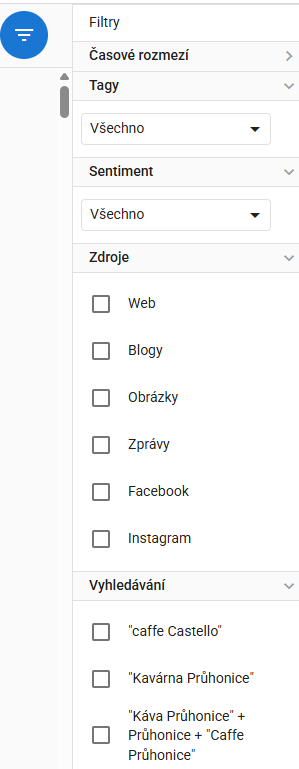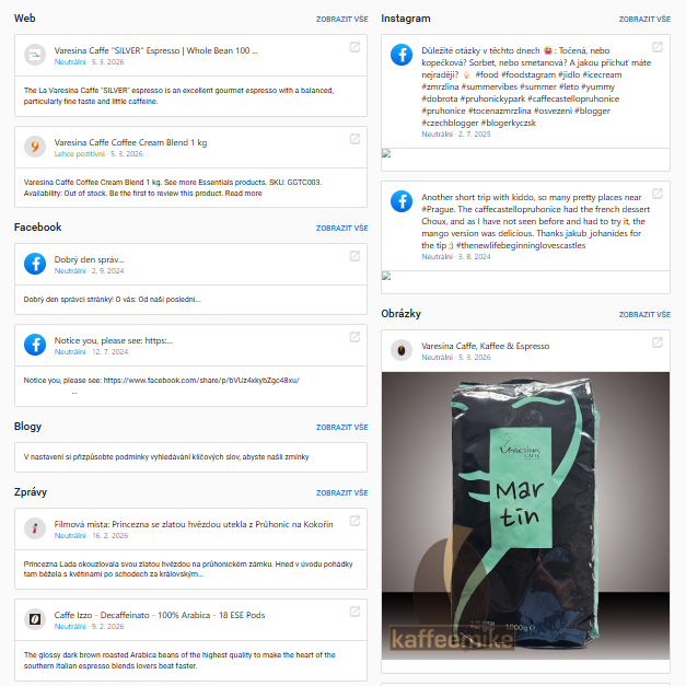 Můžete tak sledovat zmínky o vaší společnosti na internetu, a to na základě vámi zvolených klíčových slov. Zmínky jsou seřazeny dle typu zdroje, tj. web, Facebook, Instagram, Blogy, Zprávy apod. Jednotlivé sekce můžete zobrazit pomocí tlačítka "Zobrazit vše".