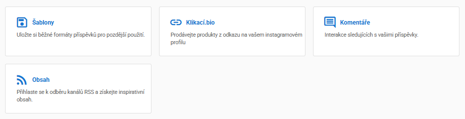 Instagram většině účtů neumožňuje vkládat do příspěvků odkazy. Pomocí aplikace clickable.bio (Klikací.bio) budete mít k dispozici webovou stránku, která se bude podobat vašemu instagramovému bio, ale vaši sledující budou moci kliknout na každý obrázek a najít produkty, služby nebo webový obsah propagovaný ve vašem příspěvku.