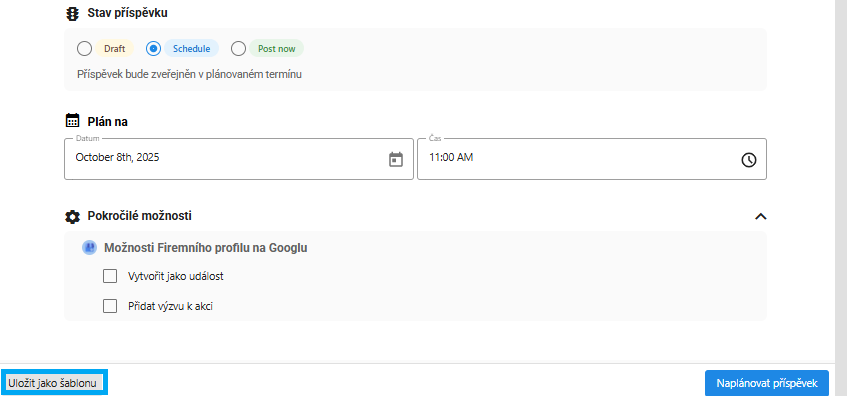 Šablonu můžete vytvořit při tvorbě příspěvku, který uložíte jako šablonu. V dolní části příspěvku v levém rohu použijte tlačítko "Uložit jako šablonu".