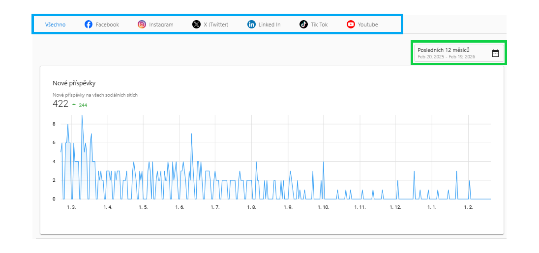 Po otevření části Výkon příspěvku uvidíte základní přehled všech příspěvků na připojených sociálních sítích. V grafu je zobrazeno množství příspěvků za zvolené období. Zobrazené období lze změnit, po kliknutí do zeleně vyznačeného pole se zobrazí nabídka předdefinovaných období (např. posledních 30 dní, posledních 6 měsíců, lze vybrat konkrétní měsíc nebo čtvrtletí) nebo lze zvolit vlastní období.