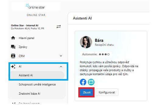2. V platformě Online Star v levém menu zvolte pole AI - Asistenti AI. Poté v části "Chat Receptionist" zvolte tlačítko "Zkusit".